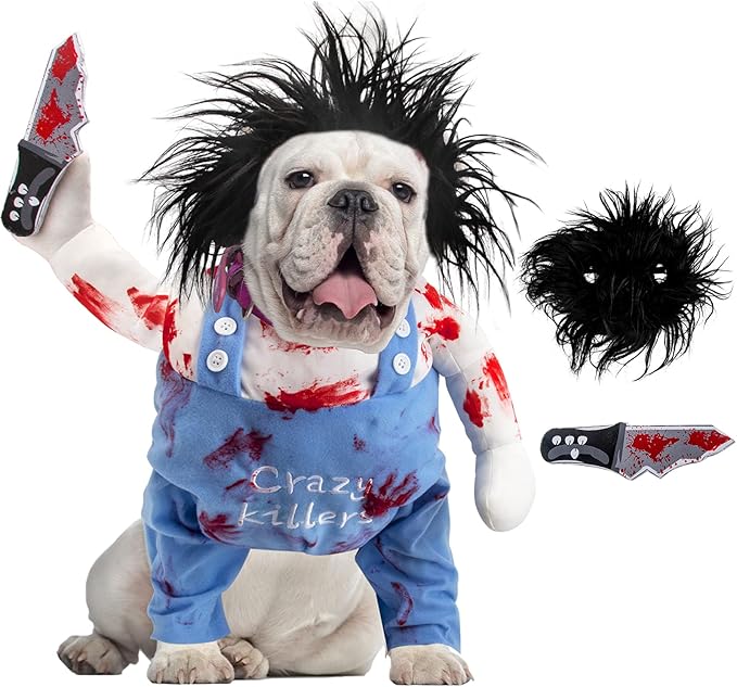 Let your dog's inner monster run free with this deadly dog costume! This half coat and hood is a comfy fit for your pup and has the decorations of a delightful toy doll. Except for that slightly suspicious knife he's wielding. We're pretty sure that's just to help you cut up the bacon bits, though!