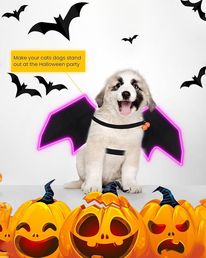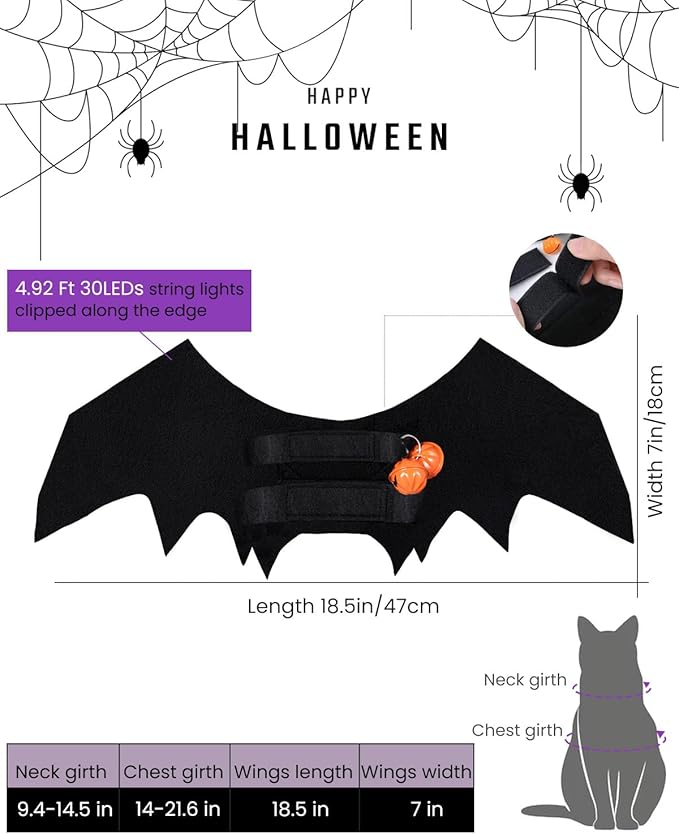 - Exclusive 2024 Glowing Halloween Cat Costume: Customized cat bat wings glow with purple lights, 4.92Ft/30LEDs string lights clipped along the edge of bat wing. All done by hand. Never fall off or get loose. Bat wing size: 18.5x7in (47x18cm). Weight: 2oz. Materials: black 4mm thick felt. Lights colour: purple. Powered by 2xCR2032 cell button(included, replaceable). Chest 14-21.6in (36-55cm), neck 9.4-14.5in (24-37cm).